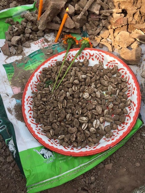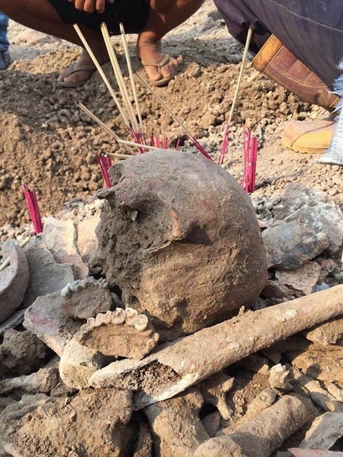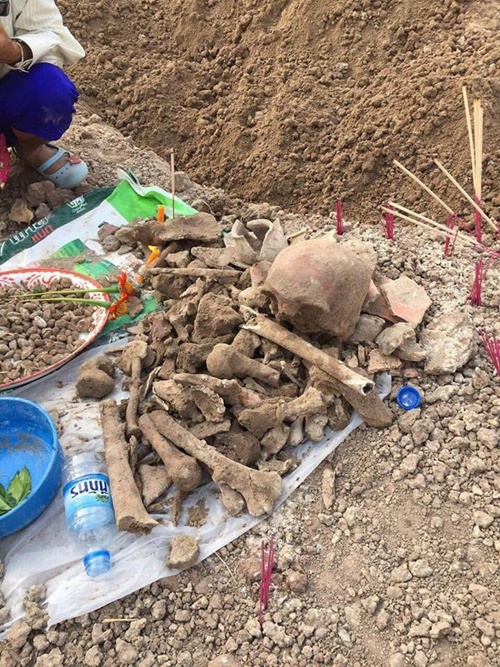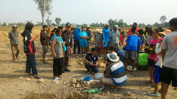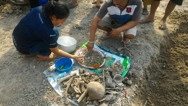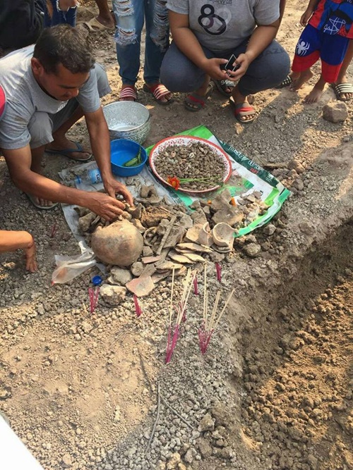 สอบถามเจ้าของที่นา เล่าว่า ช่วงบ่ายของวันที่ 25 มีนาคม ที่ผ่านมา ตนนำรถไถมาขุดปรับที่นาซึ่งเป็นเนินดิน เพื่อเตรียมทำการเกษตรในฤดูเพาะปลูกที่จะมาถึง ขณะไถปรับที่นาลึกลงไปประมาณ 1.50 เมตร ก็พบเศษโครงกระดูกมนุษย์ หม้อ ไหโบราณ มีทั้งเศษกระดูก แขน ขา กะโหลกศีรษะมนุษย์ มีฟันอยู่ประมาณ 14-22 ซี่ เศษไหแตก มีเงินเบี้ย หอย รวมกว่า 400 ชิ้น และหิน