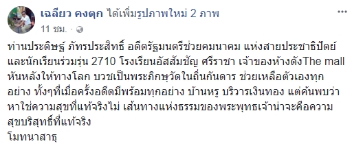 วันที่ 26 มีนาคม 2561 เฟซบุ๊ก เฉลียว คงตุก ได้เผยเรื่องราวชีวิตปัจจุบันของ นายประดิษฐ์ ภัทรประสิทธิ์ อดีตรัฐมนตรีช่วยว่าการกระทรวงการคลัง ที่ตอนนี้ได้บวชศึกษาพระธรรม ละทิ้งทางโลก หันหน้าเข้าสู่ร่มกาสาวพัสตร์เต็มตัว โดยระบุข้อความส่วนหนึ่งว่า ท่านหันหลังให้ทางโลก บวชเป็นพระภิกษุวัดในถิ่นกันดาร ช่วยเหลือตัวเองทุกอย่าง ทั้ง ๆ ที่เมื่อครั้งอดีตมีพร้อมทุกอย่าง บ้านหรู บริวาร เงินทอง แต่ค้นพบว่า หาใช่ความสุขที่แท้จริงไม่ เส้นทางแห่งธรรมของพระพุทธเจ้าน่าจะคือความสุขบริสุทธิ์ที่แท้จริง