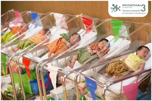 โรงพยาบาลพญาไท จับทารกน้อยใส่ชุดไทยคอกระเช้า โจงกระเบน น่ารักตะมุตะมิมาก วันที่ 30 มีนาคม 2561 หนุ่ย พงศ์สุข หิรัญพฤกษ์ ได้โพสต์ภาพลงเฟซบุ๊กสส่วนตัว พงศ์สุข หิรัญพฤกษ์ เป็นภาพสุดน่ารักของบรรดาทารกเกิดใหม่ที่สวมชุดไทย โดยในภาพจะเห็นว่าทารกสวมเสื้อและสวมโจงกระเบนลายไทยสวยงาม นอนเรียงกันอยู่บนเตียงของแต่ละคนในห้องแรกคลอด