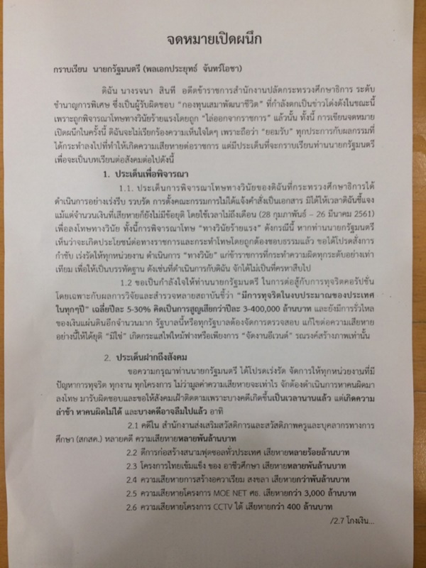 นอกจากนี้ในจดหมายยังแฉอีกว่า ยังมีคดีที่สร้างความเสียหายจำนวนมาก เช่น คดีในสำนักงานส่งเสริมสวัสดิการและสวัสดิภาพครูและบุคลากรทางการศึกษา, คดีการก่อสร้างสนามฟุตซอลทั่วประเทศ, โครงการไทยเข้มแข็งของอาชีวศึกษา, การสร้างอควาเรียม สงขลา, โครงการ MOE NET, โครงการซีซีทีวีใต้, โกงเงินธนาคารกรุงไทย, งบพัฒนาเมืองโบราณ, ทุจริตในองค์กรปกครองส่วนท้องถิ่น, ทุจริตโครงการตำบลละ 5,000,000 บาท, โครงการจำนำข้าวทุกรัฐบาล และโครงการโกงเงินคนจน ซึ่งทั้งหมดนี้เสียหายรวมหลายแสนล้าน แต่ก็ยังหาคนผิดไม่ได้แม้แต่รายเดียว