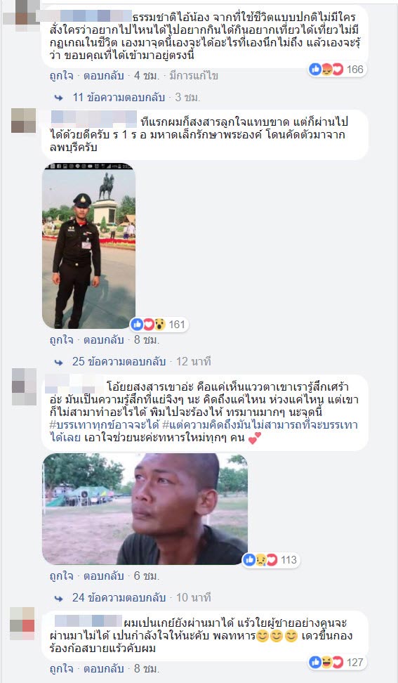 อย่างไรก็ดีอีกแง่มุมที่หลายคนอาจยังไม่เคยพบเห็น คือช่วงที่ฝึกหนักในช่วงเดือนแรก ๆ และด้วยความเหน็ดเหนื่อยรวมถึงคิดถึงครอบครัว ก็อาจทำให้ผู้ชายอกสามศอกหลั่งน้ำตาได้เช่นกัน