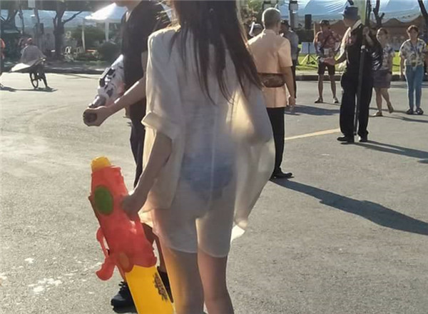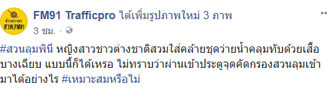เมื่อวันที่ 13 เมษายน 2561 เพจเฟซบุ๊ก FM91 Trafficpro โพสต์ภาพสาวคนหนึ่งโดยบอกว่าเป็นต่างชาติ สวมชุดว่ายน้ำกับเสื้อบางตัวใหญ่ เล่นน้ำสงกรานต์ บริเวณสวนลุมพินีโดยระบุว่า "หญิงสาวชาวต่างชาติสวมใส่คล้ายชุดว่ายน้ำคลุมทับด้วยเสื้อบางเฉียบ แบบนี้ก็ได้เหรอ "