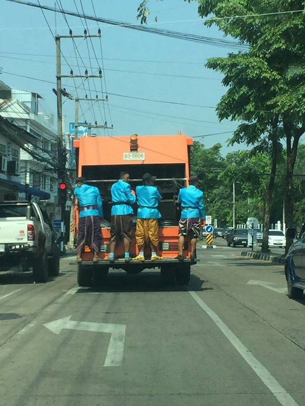 ที่พากันใส่ชุดไทยสีฟ้า นุ่งผ้าขาวม้าแบบใหม่ ยืนห้อยท้ายรถเก็บขยะ