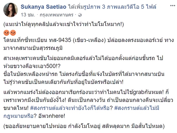 ทั้งนี้ เธอเผยว่า ปกติค่าโดยสารนั้น ต่อให้รวมค่าทางด่วนและค่าบริการแท็กซี่สนามบิน ก็จะอยู่ที่ประมาณ 300 บาท แต่ครั้งนี้แท็กซี่ไม่ยอมกดมิเตอร์ และจะเก็บเงินแบบเหมา 500 บาท ซ้ำเมื่อตกลงกันไม่ได้กลับถูกโชเฟอร์แท็กซี่พูดใส่ว่า ตอนนี้เป็นเทศกาลสงกรานต์ คนสาดน้ำ รถติด จนทำให้เธอเองไม่พอใจ ถูกทิ้งลงกลางมอเตอร์เวย์