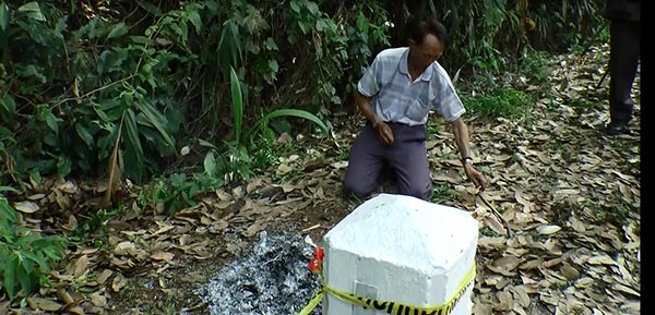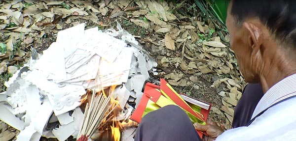 ต่อมา นายจงหรือ ยอดมณีบรรพต อายุ 72 ปี เป็นบิดาของนายทวีศักดิ์ ได้เดินทางไปยังที่เกิดเหตุ โดยนำกระดาษ ธูปเทียนและเครื่องเซ่นไหว้ต่าง ๆ ไปประกอบพิธีบอกเจ้าที่ ก่อนจะเผากระดาษพร้อมสวดมนต์ร่ายคำเป็นภาษาม้งอยู่นาน พร้อมกับร้องไห้ออกมาขณะก้มลงกับพื้นดินด้วยความเสียใจท่ามกลางบรรยากาศที่น่าสลดใจ