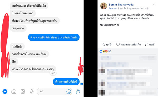 ล่าสุด แม่ค้าสาวได้มีการอัปเดตเรื่องราวดังกล่าว โดยระบุว่า ลูกค้าคู่กรณีได้มีการส่งข้อความมาขอโทษเป็นที่เรียบร้อยแล้ว จึงทำการลบโพสต์ต้นเรื่องออกไป โดยคู่กรณีอ้างว่า ไม่ต้องการให้เรื่องยืดเยื้อ และขอโทษที่พูดไม่สุภาพ เพราะความหงุดหงิด