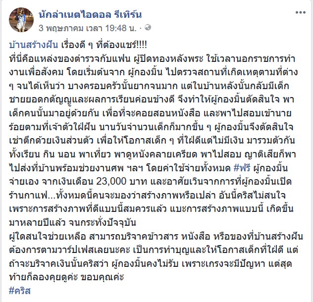 เป็นเรื่องราวที่ถูกแชร์กันอย่างมากในโลกออนไลน์ เมื่อเพจเฟซบุ๊ก นักล่าเนตไอดอล รีเทิร์น ได้มีการแชร์เรื่องราวบ้านสร้างฝันของตำรวจหนุ่มกับแฟนสาว ที่ทั้งคู่ควักเงินส่วนตัวเช่าตึกให้เด็กยากไร้อยู่ พร้อมสอนหนังสือฟรี หวังหยิบยื่นโอกาสให้เด็กมีอนาคตที่ดี โดยไม่หวังสิ่งตอบแทน
