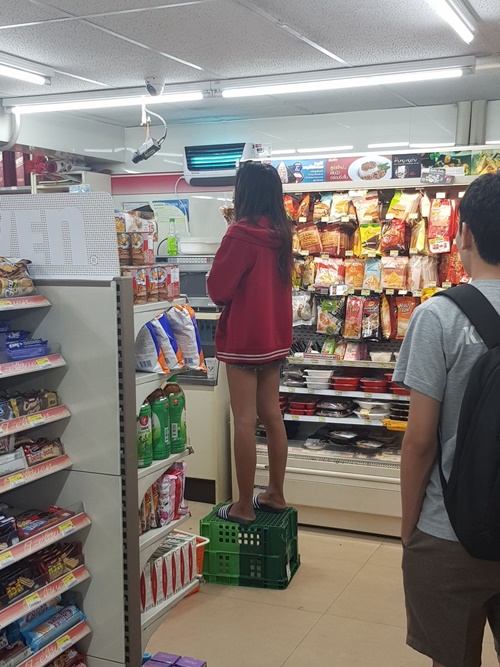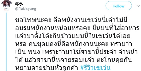 วันที่ 6 พฤษภาคม 2561 ได้มีการแชร์ภาพและข้อความจากทวิตเตอร์ @Plaizlupang โดยเป็นภาพที่ถ่ายภายในร้านสะดวกซื้อชื่อดัง สาขาหนึ่ง พร้อมข้อความระบุว่า "ขอโทษนะคะ คือพนักงานเซเว่นนี่เค้าไม่มีอบรมพนักงานหน่อยเหรอคะ ยืนบนที่ใส่อาหาร แล้วมาตั้งโต๊ะกินข้าวแบบนี้ในเซเว่นได้เลยเหรอ คนชุดแดงนี่คือพนักงานนะคะ ทราบว่าเป็นพนักงานเพราะว่ามาใช้สาขานี้ประจำ จำหน้าได้ แล้วสาขานี้หลายรอบแล้ว ตะโกนคุยกันหยาบคายข้ามหัวลูกค้า"