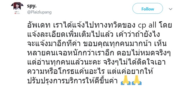 จนกลายเป็นกระแสวิพากษ์วิจารณ์อย่างหนักถึงความไม่เหมาะสม ก่อนที่ทางเจ้าของเรื่องจะเข้ามาอัปเดตข้อมูลเพิ่มเติมว่า "ได้แจ้งไปทางทวิตเตอร์ของ cp all โดยแจ้งละเอียดเพิ่มเติมไปแล้ว เค้าว่าถ้ายังไงจะแจ้งมาอีกทีค่า ขอบคุณทุกคนมากน้า เห็นหลายคนเจอหนักกว่าเราอีก ตอบไม่หมดจริง ๆ แต่อ่านทุกคนแล้วนะคะ จริง ๆ ไม่ได้ติดใจเอาความหรือโกรธแค้นอะไร แต่แค่อยากให้ปรับปรุงการบริการให้ดีขึ้นค่า"
