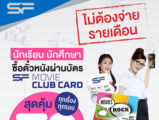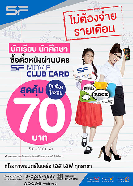 โรงภาพยนตร์ในเครือ เอส เอฟ เอาใจนักเรียน นักศึกษา ดูหนังราคาสุดพิเศษเริ่มต้นเพียง 70 บาท ทุกเรื่อง ทุกรอบ ในระบบปกติและระบบ 3 มิติ เพียงซื้อผ่านบัตร SF Movie Club Card ตั้งแต่วันนี้ - 30 มิถุนายน 2561 ที่โรงภาพยนตร์ในเครือ เอส เอฟ ทุกสาขา และเอ็มพรีเว่ ซีเนคลับ สอบถามรายละเอียดเพิ่มเติมได้ที่ SF Call Center 02-268-8888 หรือ www.sfcinemacity.com และ www.facebook.com/WeLoveSF หรือเคาน์เตอร์ประชาสัมพันธ์ที่หน้าโรงภาพยนตร์ในเครือ เอส เอฟ