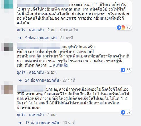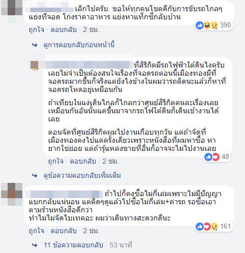 ขณะเดียวกัน คนรักหนังสือ ก็ได้บ่นอุบกันระนาวถึงการย้ ายสถานที่ดังกล่าวว่า เป็นการย้ายที่ไกลเกินไป เดินทางไม่สะดวก หรือถ้าขับรถส่วนตัวไปก็มีปั ญหาเรื่องที่จอด อีกทั้งน่าจะมีสถานที่อื่นที่ดี กว่านี้ เดินทางสะดวกกว่านี้