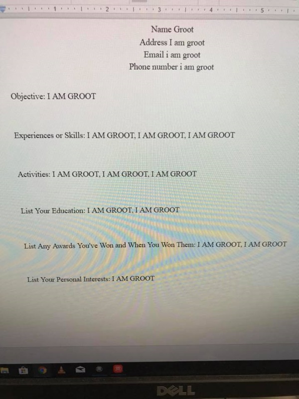 และนั่นจึงเป็นเหตุผลที่ทำให้จดหมายแนะนำตัว รวมถึงเรซูเม่ของกรูท ถูกสร้างสรรค์ออกมาอย่างสมบูรณ์แบบตามสไตล์ของกรูท ไม่ว่าจะเป็นชื่อ ที่อยู่ เบอร์โทรศัพท์ ประวัติการศึกษา รวมถึงเนื้อหาอื่น ๆ ในจดหมาย ล้วนถูกบรรยายได้ด้วยวลีเพียงหนึ่งเดียว "I am Groot"