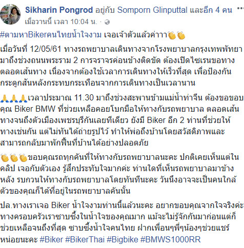 เมื่อวันที่ 13 พฤษภาคม 2561 เจ้าของเฟซบุ๊ก Sikharin Pongrod ได้โพสต์เรื่องราวสุดประทับใจ หลังจากที่พ่อของตนเองป่วยและในช่วงเวลานั้นรถติดหนัก แต่ก็มีกลุ่มมอเตอร์ไซค์ช่วยนำทางเปิดทางให้รถฉุกเฉินวิ่งได้สะดวกอย่างมาก และทำให้พ่อของผู้โพสต์ถึงบ้านโดยสวัสดิภาพและสามารถกลับมาพักฟื้นที่บ้านได้อย่างปลอดภัย