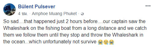 เมื่อวันที่ 18 พฤษภาคม 2561 เฟซบุ๊ก Bülent Pulsever มีการโพสต์คลิปเรือลากอวนลำหนึ่ง ได้ลากฉลามวาฬติดมาด้วย ด้วยเหตุนี้ ทางกัปตันเรือเจ้าของคลิป ก็ได้ขับเรือเข้าไปใกล้ เพื่อกดดันให้เรือดังกล่าวปล่อยตัวฉลามวาฬ