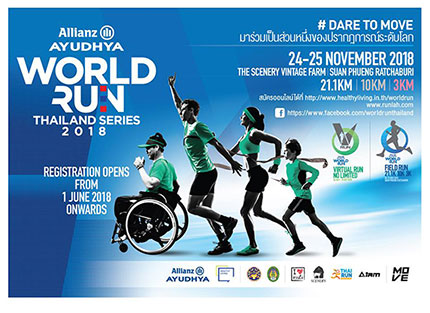 บมจ. อลิอันซ์ อยุธยา ประกันชีวิต ผนึกพันธมิตรส่วนราชการจังหวัดราชบุรี สมาคมธุรกิจท่องเที่ยวสวนผึ้ง Move Asia และ Thai.Run จัดงาน "Allianz Ayudhya World Run Thailand Series 2018" ภายใต้แนวคิด "Dare to Move" ชวนชาวไทยออกกำลังกายผ่านการวิ่งเพื่อสุขภาพที่ดีของตนเอง พร้อมส่งต่อโอกาสในการวิ่งให้ผู้พิการ เพราะทุกกิโลเมตรที่วิ่ง จะเปลี่ยนเป็นเงินบริจาคให้กับมูลนิธิคนพิการไทยเพื่อสร้างวีลแชร์ นักวิ่งที่สนใจสามารถร่วมกิจกรรมได้ 2 ซีรีส์ ได้แก่ วิ่งเก็บระยะทางแบบ Virtual Run (เวอร์ชวลรัน) บันทึกระยะผ่านระบบ online เป็นเวลา 90 วัน และการวิ่งในสถานที่จริงแบบ Field Run ณ อำเภอ สวนผึ้ง จังหวัดราชบุรี พฤศจิกายนนี้
