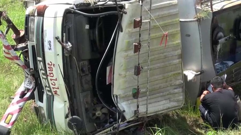 พลิกคว่ำตกร่องกลางถนน โชคดีที่ไม่เกิดไฟลุกไหม้