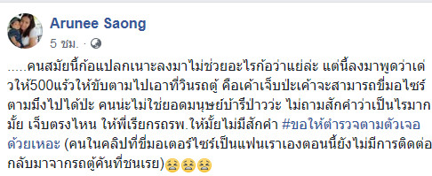 เจ้าของเฟซบุ๊ก Arunee Saong โพสต์เหตุการณ์เมื่อวันที่ 1 มิถุนายน 2561 โดยเจ้าของเรื่องเล่าเหตุการณ์ไว้ว่า "คนสมัยนี้ก้อแปลกเนาะลงมาไม่ช่วยอะไรก้อว่าแย่ล่ะ แต่นี้ลงมาพูดว่าเด่วให้ 500 แล้วให้ขับตามไปเอาที่วินรถตู้ คือเขาเจ็บป่ะขาจะสามารถขี่มอเตอร์ไซร์ตามไปได้ป่ะ คนน่ะไม่ใช่ยอดมนุษย์บ้าหรือเปล่าว่ะ " ซึ่งผู้เสียหายคือแฟนเจ้าของเรื่องและยังไม่มีการติดต่อจากโชเฟอร์รถตู้อีกด้วย