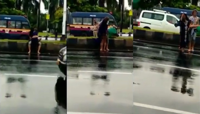 ขณะที่ฝ่ายชายนั่งอยู่บนขอบกั้นถนน