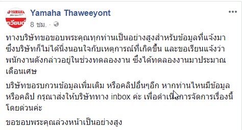 ผู้บริหารยามาฮ่า ทวียนต์ ต้นสังกัดของหนุ่มครูฝึกรายดังกล่าว โดยแจงว่า ชายในคลิปทำงานมาราว 1 เดือน ซึ่งเป็นการขับขี่นอกเวลางาน