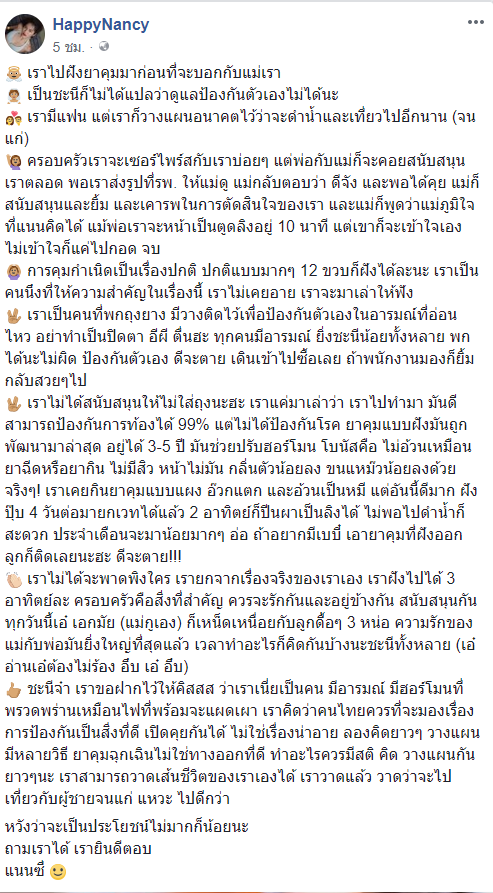 โดยในเรื่องนี้สาวมั่นอย่าง แนนซี่ นัยน์ภัค เจ้าของเพจ HappyNancy ได้โพสต์ข้อความลงเฟซบุ๊ก HappyNancy เมื่อวันที่ 13 มิถุนายน 2561 ระบุถึงประสบการณ์ที่เจ้าตัวได้เดินทางไปฝังยาคุมว่า การฝังยาคุมเป็นเรื่องปกติ ตนไม่ได้สนับสนุนไม่ให้ใส่ถุงยาง แต่การฝังยาคุมนั้นสามารถป้องกันการตั้งครรภ์ได้ 99% แต่ไม่ได้ป้องกันโรค และมองว่าคนไทยควรที่จะมองเรื่องการป้องกันเป็นสิ่งที่ดี เปิดใจคุยกันได้ ไม่ใช่เรื่องน่าอาย และควรคิดวางแผน ทำอะไรควรมีสติ