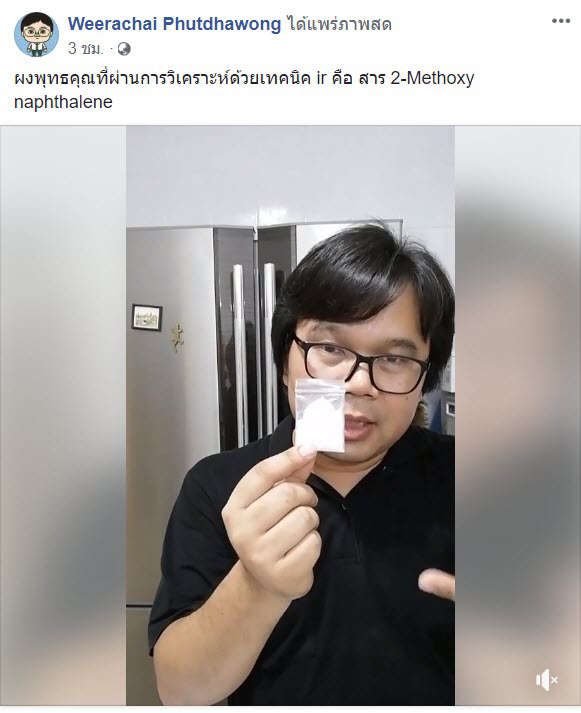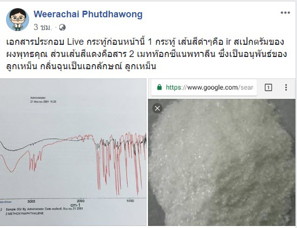 เกี่ยวกับเรื่องนี้ รศ. ดร.วีรชัย พุทธวงศ์ อาจารย์และนักวิชาการสาขาเคมีอินทรีย์ มหาวิทยาลัยเกษตรศาสตร์ กำแพงแสน ได้โพสต์ผ่านเฟซบุ๊ก Weerachai Phutdhawong โดยเป็นการเผยผลการวิเคราะห์ ผงพุทธคุณ ด้วยเทคนิค ir พบว่าเป็นสาร 2-Methoxy naphthalene ซึ่งเป็นอนุพันธ์ของลูกเหม็น กลิ่นฉุนเป็นเอกลักษณ์