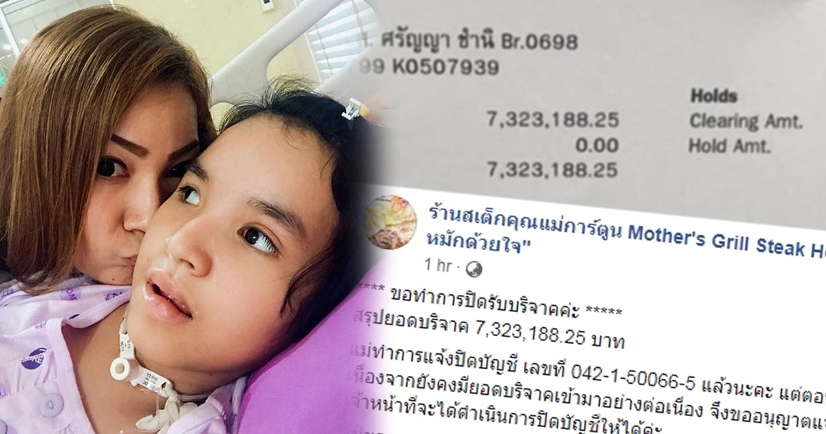 แม่น้องการ์ตูนแสนซาบซึ้งใจในความเมตตา กราบขอบคุณน้ำใจหลั่งไหลท่วมท้นจนยอดเงินมากกว่า 7 ล้าน วอนผู้ใจบุญหยุดบริจาคเงินช่วยเหลือ เพื่อต้องการปิดบัญชี