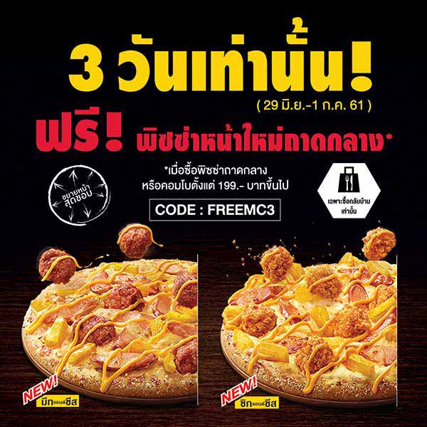 เมื่อซื้อพิซซ่าถาดกลางราคา 199 บาทขึ้นไปหรือคอมโบ (ยกเว้นชุดเติมเต็ม 159 /199/ 299) ตั้งแต่วันที่ 29 มิถุนายน