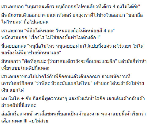 โดยเหตุการณ์เกิดขึ้นเมื่อวันที่ 28 มิถุนายน 2561 เจ้าของเฟซบุ๊ก Kanokwan Sukaram ได้โพสต์เรื่องราวที่เกิดขึ้นกับตัวเอง ซึ่งเรื่องของเรื่องลูกค้าเพียงแค่ต้องการแยกบิล แต่ฝ่ายพนักงานกลับตอบว่าไม่ได้แถมไม่รับฝากของ จนทำให้ลูกค้ารายนี้ต้องหยิบมือถือขึ้นมาถ่ายคลิป และกลายเป็นที่วิพากษ์วิจารณ์อย่างมากมายในขณะนี้
