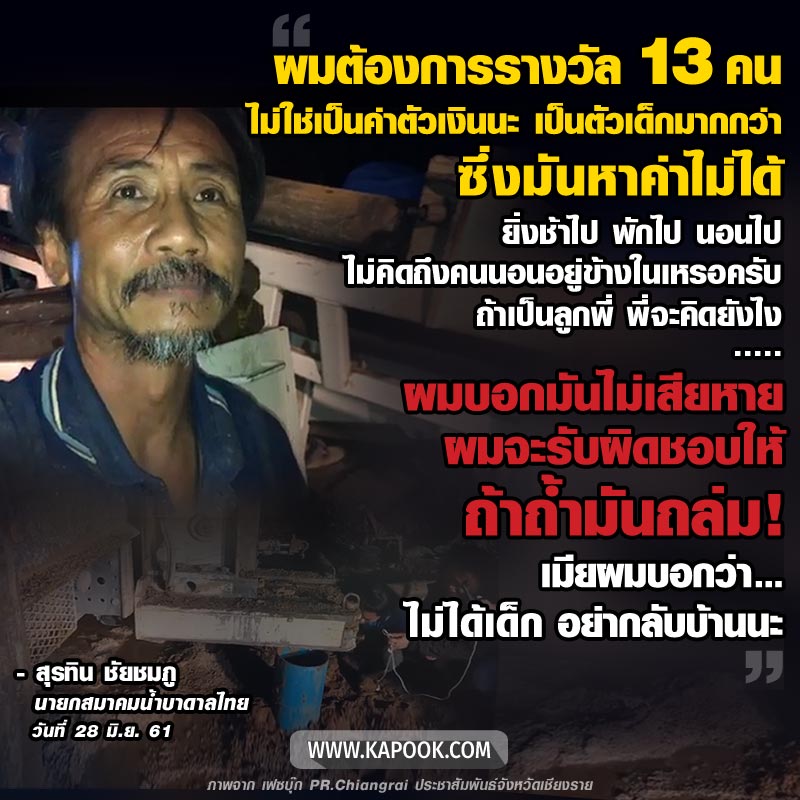 "โดยศักยภาพของช่างเจาะได้ทุกคน ผมต้องการรางวัล 13 คน ไม่ใช่เป็นค่าตัวเงินนะ เป็นตัวเด็กมากกว่า ซึ่งมันหาค่าไม่ได้ ยิ่งช้าไป พักไป นอนไป ไม่คิดถึงคนที่นอนข้างในล่ะครับ ถ้าเป็นลูกพี่พี่จะคิดยังไง อะไรคือสิ่งที่เจาะไม่ได้ อะไรที่มันจะเสียหาย ผมบอกมันไม่เสียหาย ผมจะรับผิดชอบถ้าถ้ำมันจะถล่ม มันจะถล่มได้ยังไงครับ มันถล่มได้ก็ดี มันจะได้ไม่มีถ้ำ คนจะได้ไม่ต้องเข้าไป ใช่ไหม ถ้ำมันมีชีวิตมากกว่าคนเหรอครับ มันถล่มให้มันถล่มไปเลย เด็กจะได้ไม่ต้องเข้าไป ผมพูดถูกไหมครับ ผมเครียดมากเลย เมียผมบอกว่าไม่ได้เด็กอย่ากลับบ้าน" นายสุรทิน ชัยชมภู นายกสมาคมน้ำบาดาลไทย กล่าว