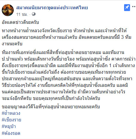วันที่ 29 มิถุนายน 2561 เพจเฟซบุ๊ก สมาคมนิยมรถขุดแห่งประเทศไทย ได้โพสต์ข่าวดีเกี่ยวกับการช่วยเหลือ 13 ชีวิต ถ้ำหลวง ว่า "ทางหน้างานถ้ำหลวงจังหวัดเชียงราย หัวหน้าปพ.และเจ้าหน้าที่ให้เครื่องสแตนด์บายคอยที่หน้างานแล้วครับ อัปเดตนะครับตอนนี้มี 3 ทีมงานนะครับ" อีกเรื่องดีที่หลาย ๆ คนชื่นชม และขอให้ทำสำเร็จ