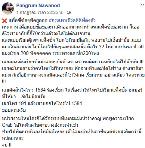 โดยเจ้าของเรื่องได้ระบุไว้ส่วนหนึ่งว่า "เลยลองเดินเรียกที่แ_่งจอด ๆ กันข้างทางทำรถติดยาวเหยียดไม่ไปสักคัน !!! เลยตะโกนถามว่าคนไทยไม่รับเหรอคะ คือส่ายหัวและปิดไฟว่าง ต่างชาติมาแ_่งกวักมือยิก ๆ เขาจะกดมิเตอร์ก็ไม่ให้กด เรียกเหมาอย่างเดียว"