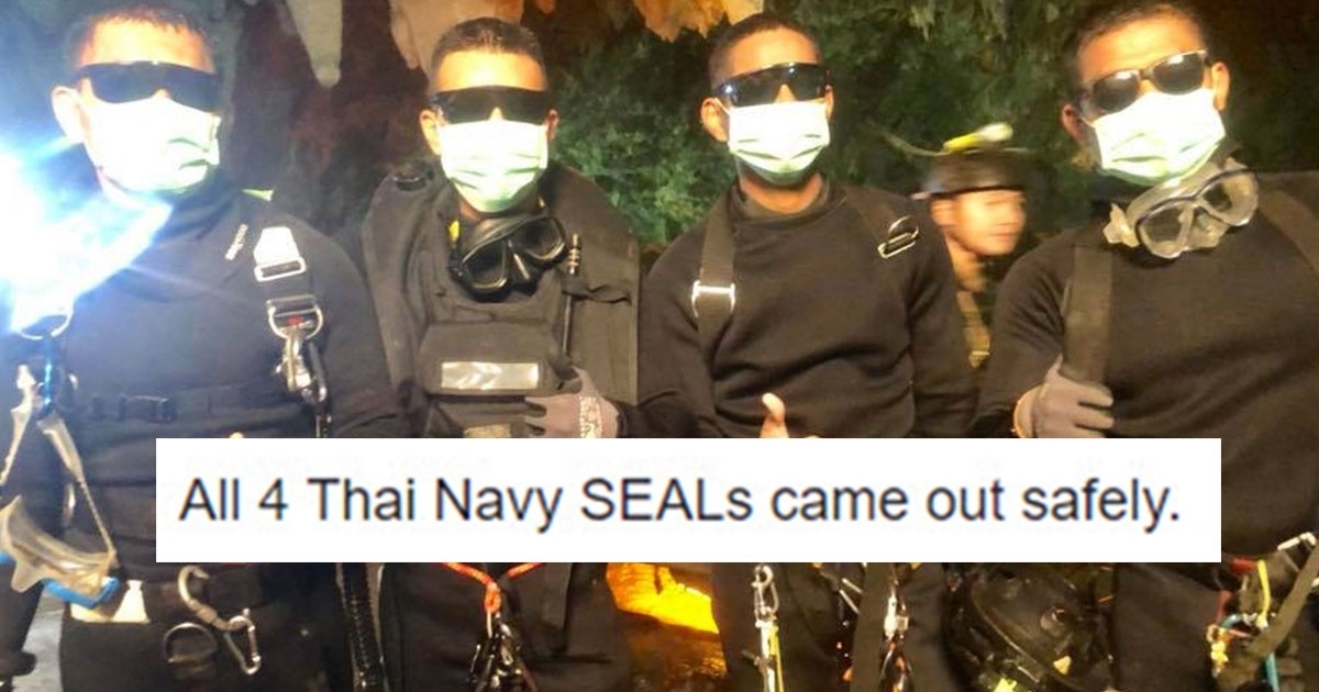 เฟซบุ๊ก Thai NavySEAL ลงภาพหน่วยซีลชุดสุดท้ายออกจากถ้ำหลวงหลังเสร็จสิ้นภารกิจ ระบุ "4 ฉลามขาว ออกจากถ้ำอย่างปลอดภัย"