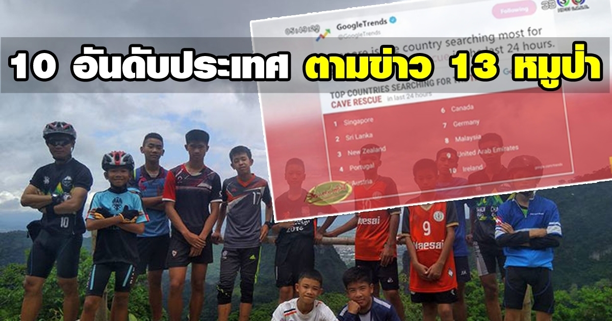 เปิด 10 ประเทศที่สนใจตามข่าวการช่วยเหลือ 13 หมูป่า ออกจากถ้ำหลวง แห่เสิร์ช Google จนติดเทรนด์ - สิงคโปร์ มากที่สุดอันดับ 1 ตามมาด้วย ศรีลังกา