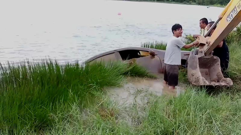 ในที่เกิดเหตุ เจ้าหน้าที่ได้ประสานขอรถแบ็กโฮมาช่วยดึงรถขึ้นจากน้ำ ใช้เวลากว่า 20 นาที จึงสามารถนำรถขึ้นมาจากน้ำได้สำเร็จ ซึ่งจากการตรวจสอบเป็นรถเก๋ง สีเทาดำ หมายเลขทะเบียน ญล 4327 กรุงเทพมหานคร สภาพเปื้อนโคลนเต็มคันรถ เจ้าหน้าที่กู้ภัยใช้เครื่องตัดถ่างงัดประตูรถออกมา