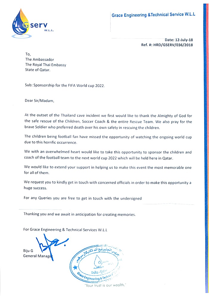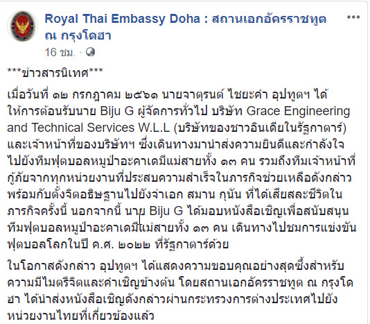 เมื่อวันที่ 12 กรกฎาคม 2561 เฟซบุ๊ก Royal Thai Embassy Doha :