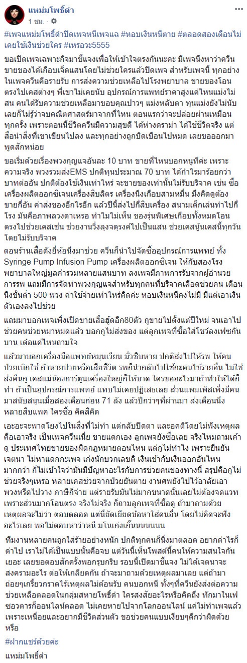 (อ่านข่าว เพจแจ่มจรัส แฉยับ เพจการกุศลบังหน้า ขายของได้หลักแสน ก่อนปิดเพจหายเงียบ)