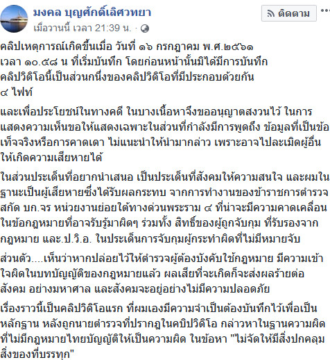 วันที่ 17 กรกฎาคม 2561 ผู้ใช้เฟซบุ๊กรายหนึ่งใช้ชื่อว่า "มงคล บุญศักดิ์เลิศวทยา" ได้โพสต์คลิปที่ตนเองถ่ายขณะที่คุยกับตำรวจ โดยระบุข้อความว่า "สิ่งที่นำมาโพสต์เพราะอยากนำเสนอประเด็นที่สังคมควรสนใจ และผมในฐานะเป็นผู้เสียหายซึ่งได้รับผลกระทบ จากการทำงานของข้าราชการตำรวจ สกัด บก.จร. หน่วยงานย่อยใต้ทางด่วนพระราม 4 ที่น่าจะมีความคลาดเคลื่อนในข้อกฎหมายที่อาจรับรู้มาผิด ๆ รวมทั้ง สิทธิ์ของผู้ถูกจับกุม ที่รับรองจากกฎหมาย และ ป.วิ.อ. ในประเด็นการจับกุมผู้กระทำผิดที่ไม่มีหมายจับ เห็นว่าหากปล่อยไว้ให้ตำรวจผู้ต้องบังคับใช้กฎหมาย มีความเข้าใจผิดในบทบัญญัติของกฎหมายแล้ว ผลเสียที่จะเกิดก็จะส่งผลร้ายต่อสังคมอย่างมหาศาล และสังคมจะอยู่อย่างไม่มีความปลอดภัย"