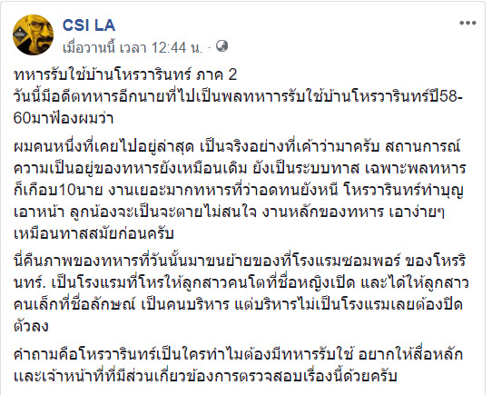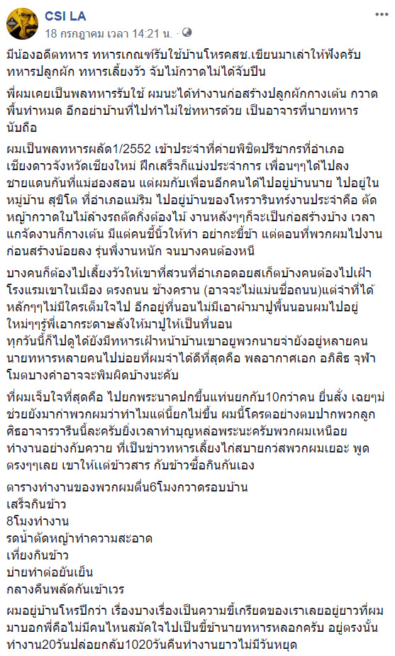 จากกรณีที่เพจเฟซบุ๊ก CSI LA ได้โพสต์เรื่องราวที่มีอดีตทหารเกณฑ์หลายราย เผยว่าถูกส่งไปทำงานที่บ้าน นายวารินทร์ บัววิรัตน์เลิศ หรือ โหรวารินทร์ นักพยากรณ์ชื่อดังที่ จ.เชียงใหม่ โดยถูกสั่งให้ ปลูกผัก เลี้ยงวัว ทำความสะอาดบ้าน บางรายถูกใช้งานหนักจนต้องหนีนั้น
