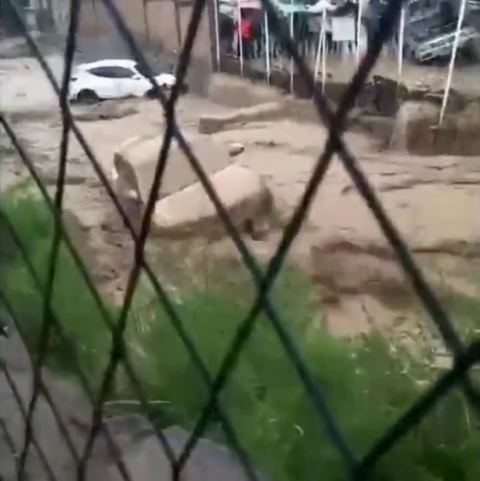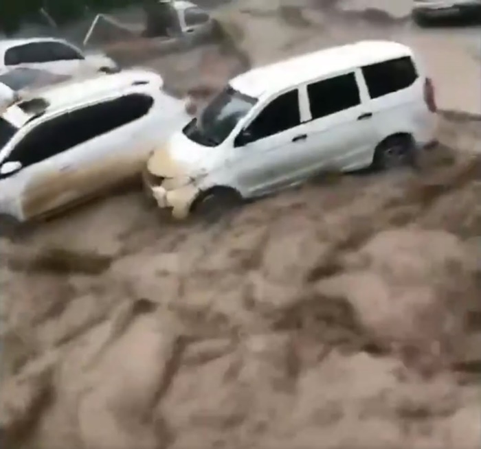 ทำให้บ้านเรือนเสียหาย และรถยนต์จำนวนมากถูกกระแสน้ำไหลพัดไปไกลตลอดเส้นทาง