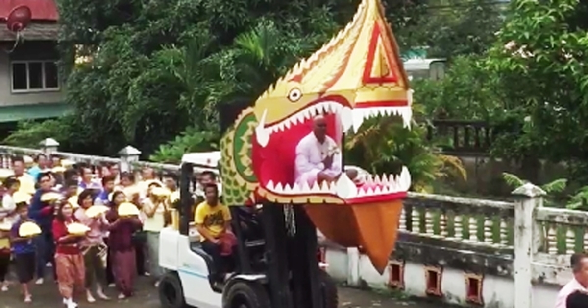 ถือว่าสุด..แห่นาคยุค 4.0 ให้นาคนั่งบนรถโฟล์กลิฟต์ที่ประดิษฐ์เป็นหัวพญานาคอ้าปาก แห่รอบโบสถ์สร้างสีสันท่ามกลางญาติพี่น้องนับร้อย
