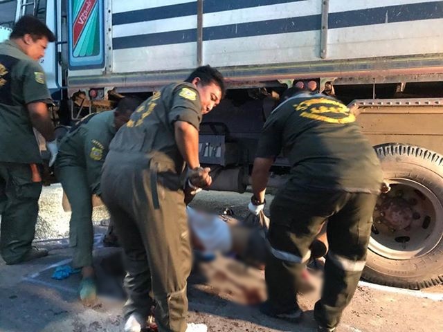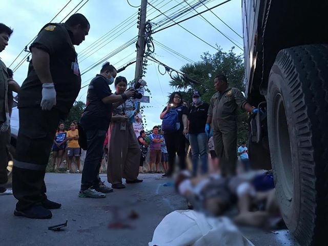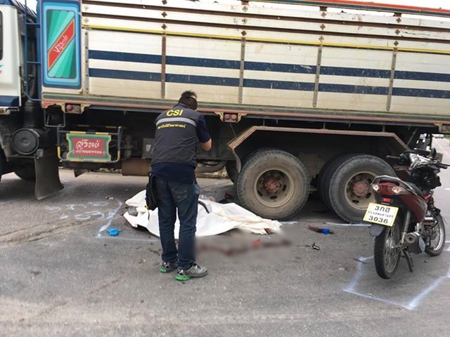 2 หนุ่มขี่รถจักรยานยนต์พุ่งชนกลางรถบรรทุก 10 ล้อเต็มแรงเสียชีวิต ด้านคนขับรถบรรทุกหลบหนี ผู้เห็นเหตุการณ์เผยเห็นรถใหญ่กำลังเลี้ยว แต่รถผู้ตายไม่เบรกจนชนสนั่น