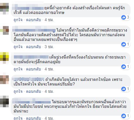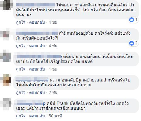 แต่งานนี้หลายความเห็นในโลกออนไลน์ไม่ขำด้วยกับการกระทำของพ่อหนุ่มคนนี้ และระบุว่าหากคนที่ตกใจจริง ๆ แล้วเกิดช็อกขึ้นมา จะรับผิดชอบอย่างไร และมีช่วงที่คนตกใจวิ่งลงไปบนถนน หากมีรถชนขึ้นมาจะยังตลกอยู่หรือไม่