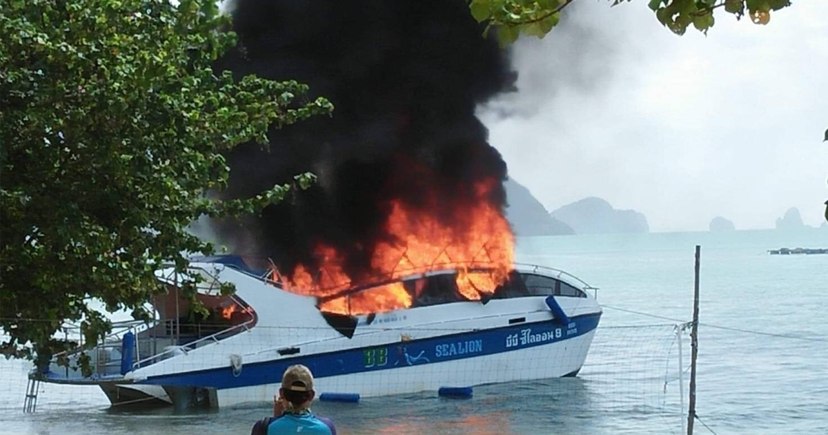 เรือสปีดโบ๊ทระเบิดที่จ.พังงา ไฟลุกท่วมทั้งเรือ เคราะห์ดีขณะเกิดเหตุ นักท่องเที่ยวกำลังลงเล่นน้ำจึงรอดมาได้หวุดหวิด แต่มีผู้บาดเจ็บ 1 ราย เป็นช่างเครื่องถูกไฟคลอก