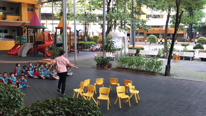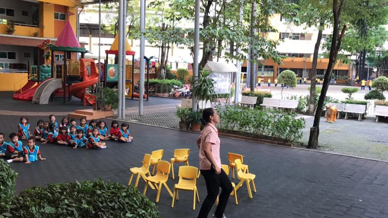 ขณะกำลังสาธิตวิธีเล่นเก้าอี้ให้เด็กนักเรียนตัวน้อยดู ทำให้เห็นมุมน่ารัก ๆ