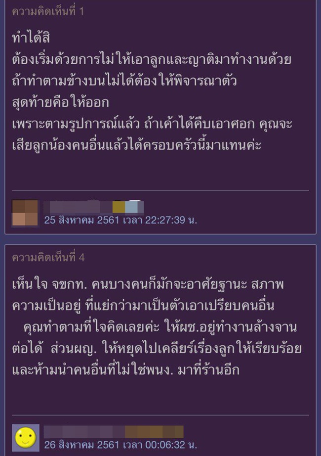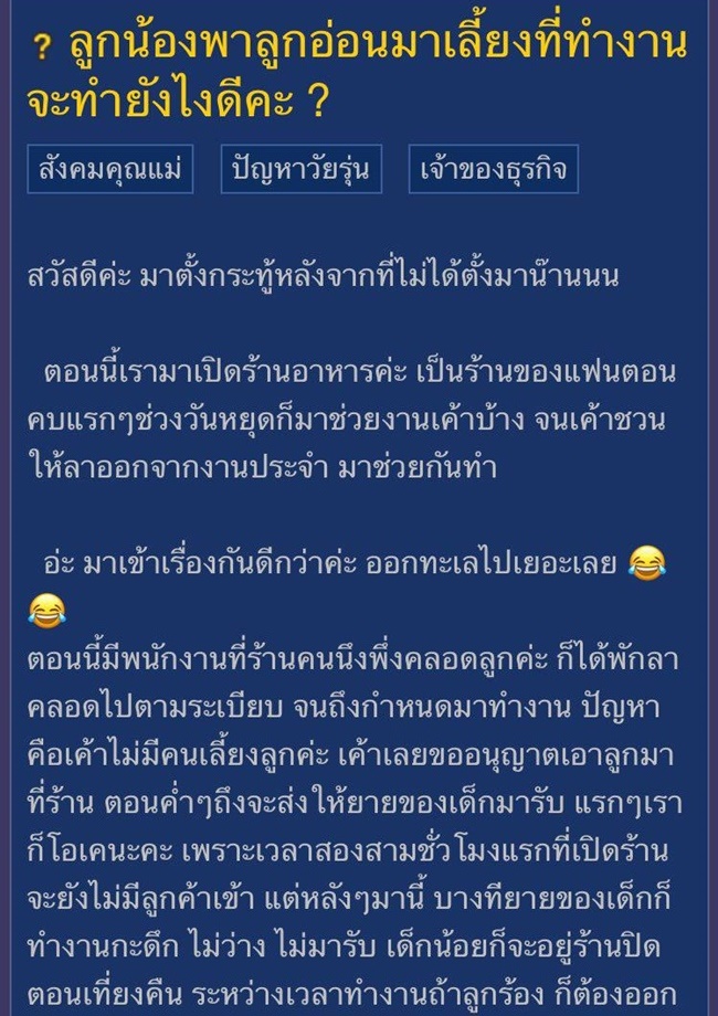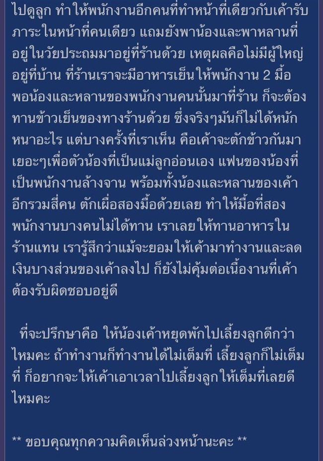 สาวเจ้าของร้านอาหารเก็บกด เมื่อลูกน้องพาลูกอ่อนมาเลี้ยงที่ทำงานด้วย อ้างไม่มีคนเลี้ยงดู ซ้ำยังพาน้องกับหลานมากินข้าวที่ร้านด้วยอีก ทำงานก็ไม่เต็มที่ ลูกร้องก็ต้องไปดูแลตลอด จะทำอย่างไรดี !?