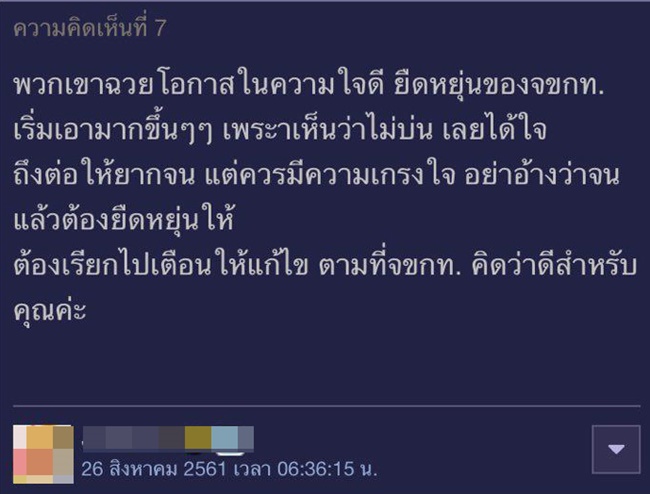จากเรื่องราวของเจ้าของกระทู้ ก็มีชาวพันทิปเข้ามาคอมเมนต์กันเพียบ และแนะนำให้เจ้าของร้านพูดคุยกับลูกน้องไปตามตรง เพื่อไม่ให้ลูกน้องใช้ข้ออ้างฐานะความเป็นอยู่ที่แย่กว่า มาเอาเปรียบคนอื่น ทั้งยังมีคอมเมนต์ที่ชี้ให้เห็นรากฐานของปัญหานี้ ที่มีอยู่ในสังคมไทยปัจจุบันนี้อีกด้วย