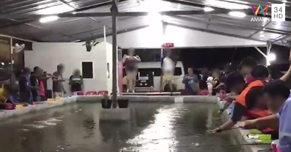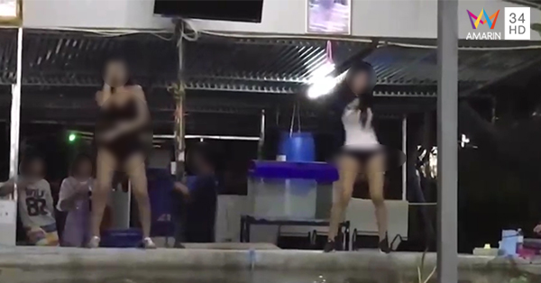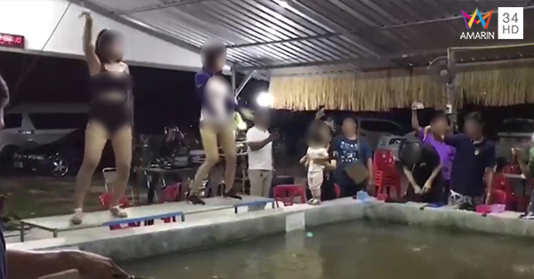 แต่งตัวนุ่งน้อยห่มน้อยยืนเต้นประกอบเพลงริมขอบบ่อกุ้ง ซึ่งเจ้าของบ่อกุ้ง