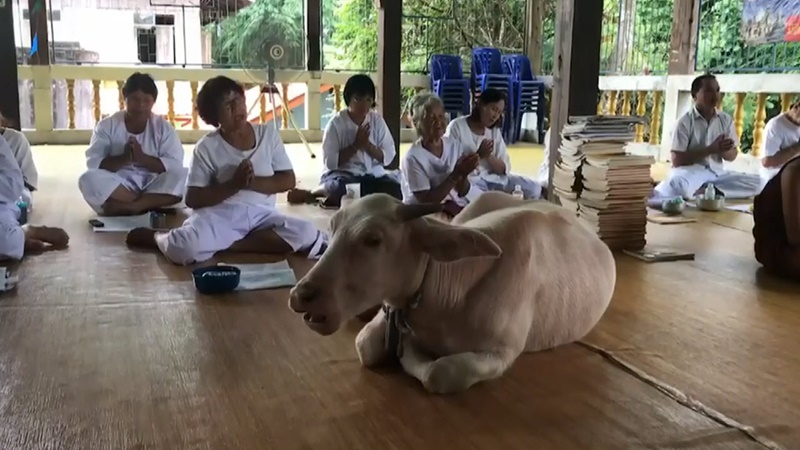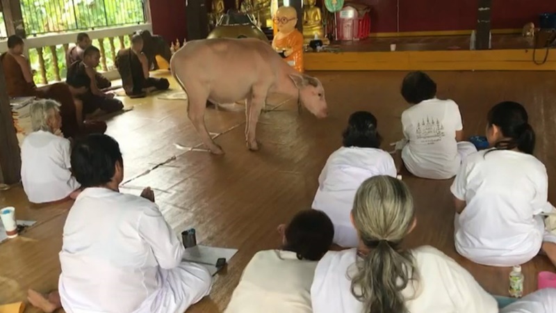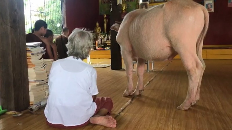 เจ้าบุญค้ำนำโชค ควายเผือกยอดกตัญญู หลังเจ้าอาวาสวัดวังอ้อ จ.อุตรดิตถ์ ไถ่ชีวิต จะตื่นเช้าเดินตามพระบิณฑบาตด้วยทุกวัน ทั้งยังขึ้นศาลาฟังพระกับแม่ชีสวดทำวัตรอีกด้วย