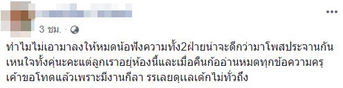 ล่าสุด เมื่อวันที่ 7 กันยายน 2561 ได้มีชายที่ระบุว่าเป็นครู ได้โพสต์ภาพบทสนทนาทั้งหมด พร้อมตัดพ้อว่า น่าจะเอาข้อความมาลงให้หมด ซึ่งทางครูได้ขอโทษไปก่อนหน้าแล้ว ยอมรับว่าเป็นวันกีฬาสี อาจจะดูแลไม่ทั่วถึง แต่ทางผู้ปกครองก็ยังบี้ไม่หยุด