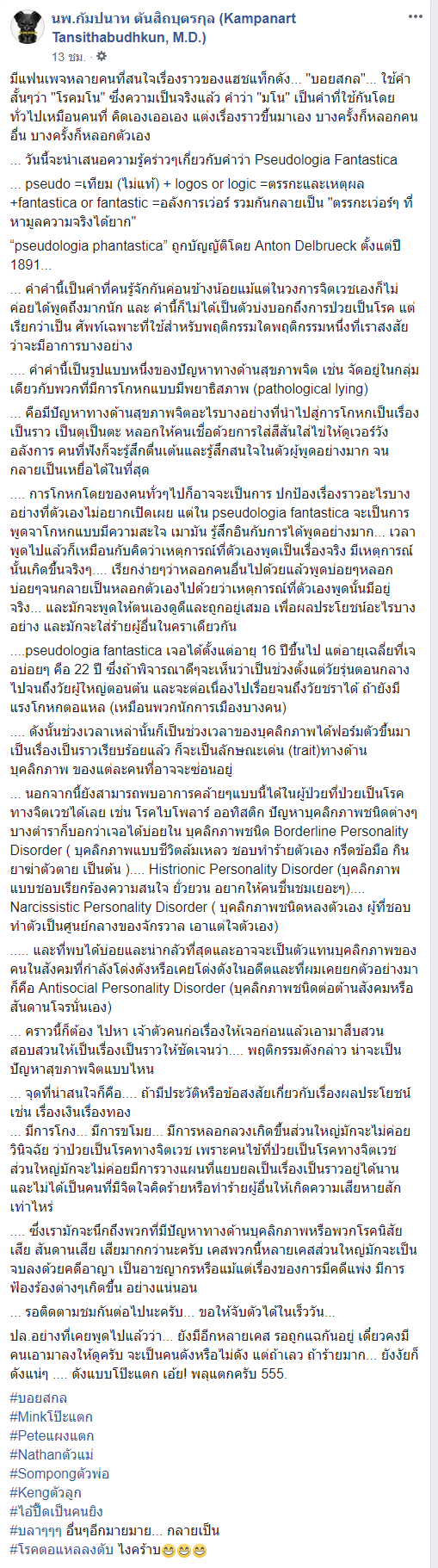 ได้โพสต์ข้อความผ่าน เฟซบุ๊ก นพ.กัมปนาท ตันสิถบุตรกุล (Kampanart Tansithabudhkun, M.D.) ระบุว่า พฤติกรรมของ บอยสกล นั้น ใช้คำเรียกสั้น ๆ ว่า โรคมโน